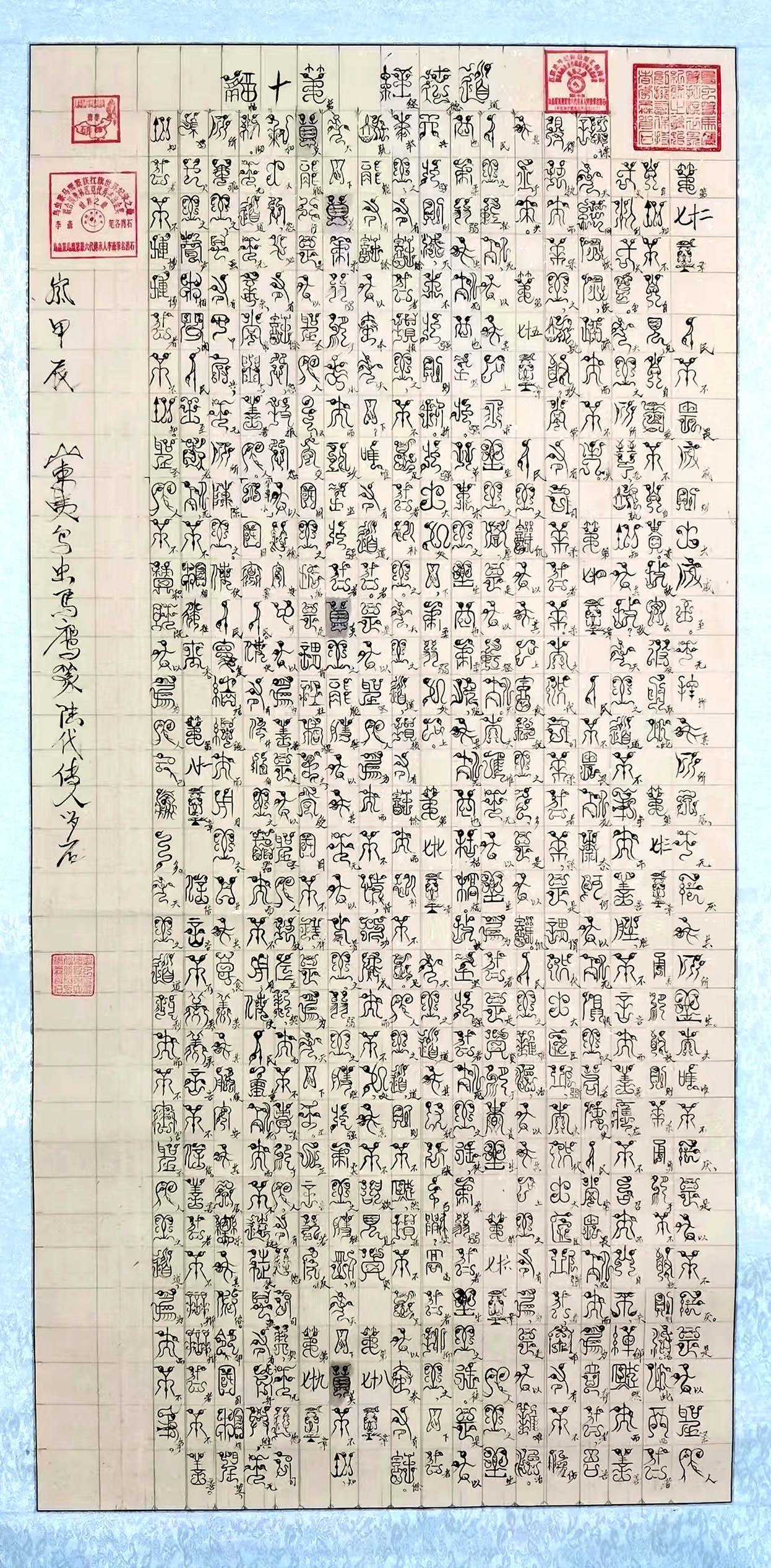 扛旂世界纪录之最,鸟虫篆,马鹰篆始创者,保持者,拥有著作权证书数量最多者李森,笔名肖石。被中央美术学院,清华大学美术学院,山东联大特聘为客座敎授,负责鸟虫篆马鹰篆教学和研究。本祖鸟虫篆,马鹰篆非遗文化起源于道光五年,公元1825年。到了2025年整200周年的发展史。鸟虫篆是秦始皇统一六国,统一文字定为秦国八体之一,李斯大臣用鹤石壁(皇篆体)鸟虫篆体雕刻了秦始皇玉玺大印章,(受命于天,吉寿永昌)八个大字,为至高集权的象征。最值的提起的鸟虫篆,马鹰篆第六代传承人李森属牛,生于1949年,担任(中国孔子学院)常务副院长,担任(中国孔子书画家协会)副主席,将这非遗文化推向了一个扛旂世界纪录之最。用鸟虫篆和马鹰篆书法已获版权的有:曹操的(观沧海),(神龟寿),孔孑的(论语),楊慎的(临江仙),岳飞的(满江红),周兴嗣的(千字文),朱熹的(朱子家训),朱柏廬的(治家格言),(劝孝歌),范中淹的(岳阳楼记),苍颉的(二八字),(108字的成语),毛泽东的(清平乐,六盘山),(泌园春,雪),李森的(牛气冲天),(牛转乾坤),(竹报平安),(虎啸千里),(风景这边独好),(玖牛之力),(腾飞汗血宝马),(牧羊犬),(三羊开泰),(鹰击长空),(马上封猴),(龙腾虎跃),(鲤鱼跳龙门)。最值得一提的是(心经)和中华第一圣书(兰亭序),喜获中华人民共和国国家版权证书,根据(伯尔尼)世界公约179个缔约国承认为世界版权,受到世界知识产权保护。最近2021年11月24日第一幅马鹰篆书法(观沧海)诞生了,也喜获了马鹰篆著作权证书。(本祖马鹰篆书法在中国篆体书法中占有了一席之地),在马鹰篆领域中又是一个世界纪录始创者。到2022年5月19日共获32枚版权证书。2022年3月19日鸟虫篆(心经)(兰亭序)。马鹰篆(观沧海)等7幅作品被选编进(清末—2022年近当代中国美术史)文献巨著。紧接着词龙辛弃疾的(金粟如来出世)及词意创画被选编进(东亚文化之都)高峰论谈大16开精装画册。2023年3月24日被选编进中国美术出版社出版的(中国艺术传承大师)的巨著书中。2019年到2022年在中国美术家(官)网人气指数一直为第一名(榜首),2022年4月10日22点22分在中国美术家(官网)人气指数突破千万大观为第一名(榜首)保持三年的第一的业绩,到2023年10月打破两千万大观为榜首仍为第一名,保持四年第一的业绩。2022年7月21日(限量版珍藏邮册,文化强民族强)弘扬中华文化推动(一带一路)建设实现中华民族伟大复兴中国梦,给扛旂世界纪录之最,鸟虫篆马鹰篆始创,拥有,保持者李森先生印制了纪念章,纪念封,明信片,邮通卡,专属纪念票和邮票。鸟虫篆中国第一圣书【兰亭序】脱颖而出获得2024年【联合国奥林匹克优秀杰出金奖】并颁发奖状证书。注:山东省济南市天桥区西苑小区,李森—18663721498