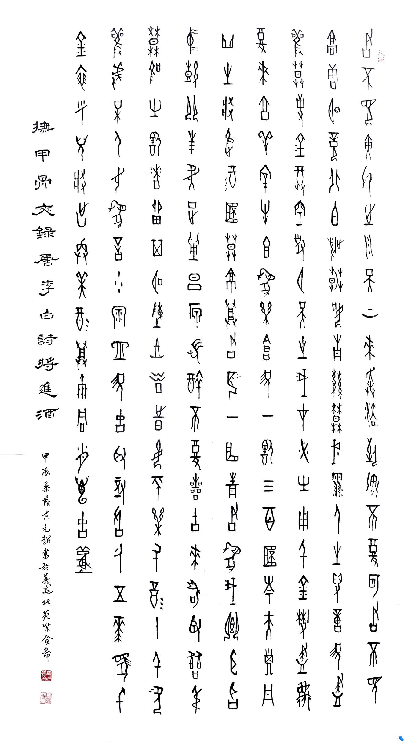 黄元超,字:廷砚,号:紫金斋主,出生于1965年,浙江金华市浦江人士。幼承庭训,修文习武。青年时研习金文、篆书、隶书。承书法篆刻名师蒋维崧老师的指点,后为上海朱复戡大师高徒,又拜当代书画金石篆刻大师任佐予先生门下,授为关门弟子,经任佐予老师的悉心栽培。在甲骨文、金文、铁线篆、篆书、隶书等书艺方面日渐成熟,并兼各家所长。笔妙精熟,奔畅稳健,雄强奇崛,苍劲老辣,格调雅逸,尤其甲骨文与金文、铁线篆已显独特风格。