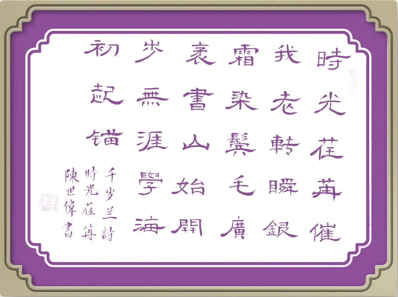 陈世伟:笔名:塵世,男,汉族,1954年12月生,1972年12月应征入伍,2014年12月从重庆市未成年犯管教所退休,正处级调研员,三级警监。大专文化。现为重庆市教育书画院协会研究员,中国翰林院书画院协会会员,中国书法家协会会员,国家一级书法师。自幼怀揣对书法的热爱,年轻时曾练过一段时间书法,后因工作繁忙及生活压力中途少于拾笔。但对笔墨的痴情,未曾真正消逝。退休后,生活节奏放缓,特别是一场疾病的降临,意外地成为了重启书法之旅的契机,便在挥毫泼墨间休养生息,书法成为我生活的一剂良药,促进健康!2023年踏上网络学习书法之路,每天苦练不辍,大约大半年时间每天坚持在10小时左右,至今兴趣未减仍保持在4小时以上。有了一定基础后,2024年上半年4月下旬开始尝试参赛,最初征战“秦韵杯”,首战获“潜力奖”,6月再战获“优秀奖”。下半年在“大地杯”获“一等奖”,“兰亭杯”获专家点评“金奖”,“墨缘堂”获“一等奖”及“华夏杯”“金奖”。并荣获“全国书画艺木大赛”金奖书法家。还上传到“百度”“网易”进行宣传报导。2025年参加翰墨幹杯赛获“一等奖”“砚池杯”特等奖。并被中国传统文化中心等几家联名授予“人民艺术家”荣誉称号。